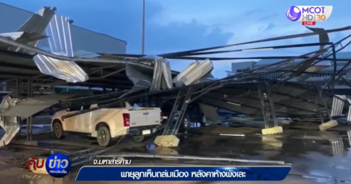 พายุลูกเห็บถล่มเขตเทศบาลเมืองมหาสารคามนานกว่า 1 ชั่วโมง ต้นไม้ล้มทับรถยนต์ หลังคาที่จอดรถห้างดังพังเสียหาย น้ำท่วมขังหลายจุด