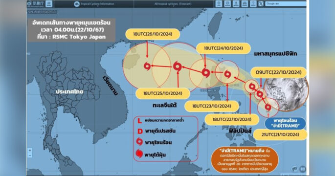 กรมอุตุนิยมวิทยาระบุ พายุดีเปรสชันในมหาสมุทรแปซิฟิกตะวันตก ทวีกำลังแรงขึ้นเป็นพายุโซนร้อน “จ่ามี (TRAMI)” แล้ว คาดขึ้นฝั่งฟิลิปปินส์ 24 – 25 ต.ค. นี้ แล้วเคลื่อนตัวเข้าใกล้ชายฝั่งเวียดนามในระยะต่อไป อาจส่งผลให้ภาคตะวันออกเฉียงเหนือของไทยมีลมแรง ส่วนภาคใต้ฝั่งอันดามันมีฝนตกต่อเนื่องและตกหนักบางแห่ง