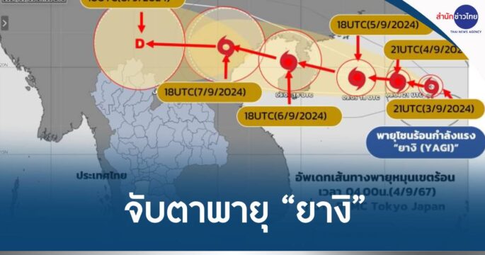 กรมอุตุฯ ติดตามพายุโซนร้อนกำลังแรง “ยางิ” บริเวณทะเลจีนใต้ตอนบน คาดขึ้นฝั่งเวียดนามราว 7-8 ก.ย. แล้วอ่อนกำลังลงที่ลาว แม้ไม่เข้าไทยโดยตรง แต่จะส่งผลให้ประเทศไทยมีฝนเพิ่มขึ้น จึงต้องเฝ้าระวังฝนที่จะตกต่อเนื่องตั้งแต่ 8-13 ก.ย. โดยเฉพาะพื้นที่ตอนบน