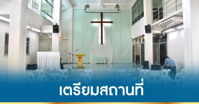เจ้าหน้าที่ประจำคริสตจักรเมธอดิสท์ รังสิต คลอง 4 ปทุมธานี เริ่มจัดเตรียมสถานที่ภายในหอประชุมตึกมัสการ สถานที่ประกอบพิธีฌาปนกิจศพ “แตงโม ภัทรธิดา” ในวันพ