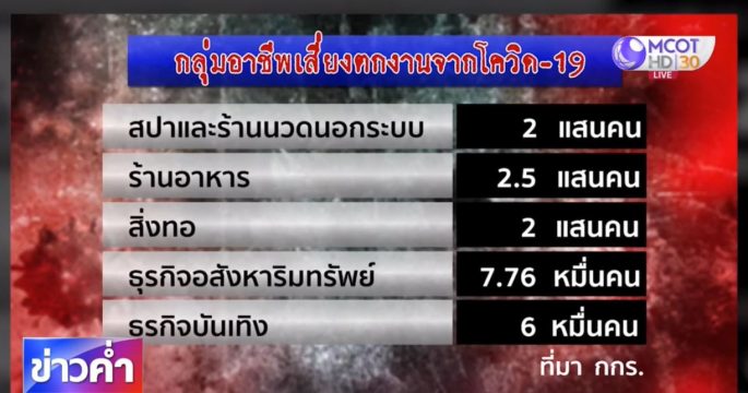 ภาคเอกชนประเมินว่าหากสถานการณ์การแพร่ระบาดของโควิด-19 ยังยืดเยื้อ ในเดือนมิถุนายนนี้จะมีแรงงานจากหลายกลุ่มอาชีพตกงานกว่า 7 ล้านคน