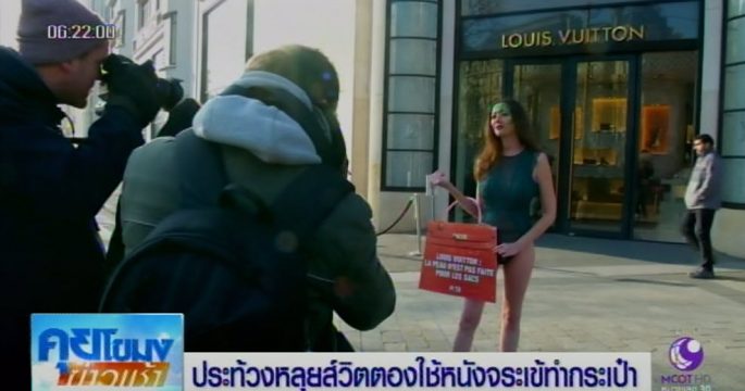 กลุ่มเคลื่อนไหวเพื่อสิทธิสัตว์พีต้า ชูป้ายประท้วงหน้าร้าน Louis Vuitton กรุงปารีส ประเทศฝรั่งเศส ต่อต้านใช้หนังจระเข้ทำกระเป๋าหรู