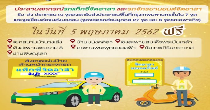 กรมขนส่งทางบกจัดแท็กซี่-มอเตอร์ไซค์จิตอาสา วิ่งให้บริการฟรี 5 พ.ค.นี้ รับ-ส่ง ปชช.ร่วมงานพระราชพิธีฯ