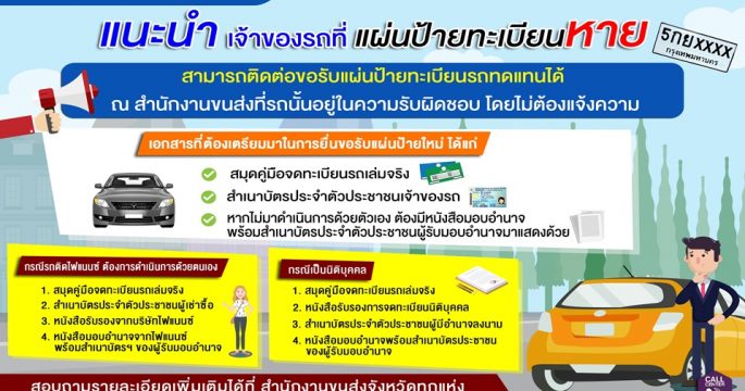กรมขนส่งทางบกแนะเจ้าของรถแผ่นป้ายทะเบียนหล่นหาย ขอแผ่นป้ายทดแทนได้ที่สำนักงานขนส่ง ไม่ต้องแจ้งความ