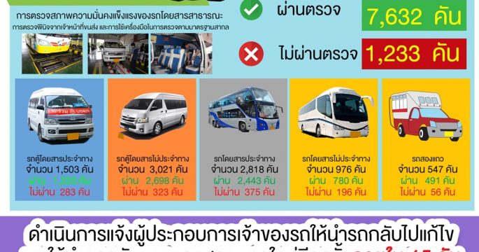 ขนส่งฯ เผยผลตรวจสภาพรถโดยสารสาธารณะ 2-13 ก.ย. พบรถไม่ผ่านเกณฑ์ 1,233 คัน จาก 8,865 คัน