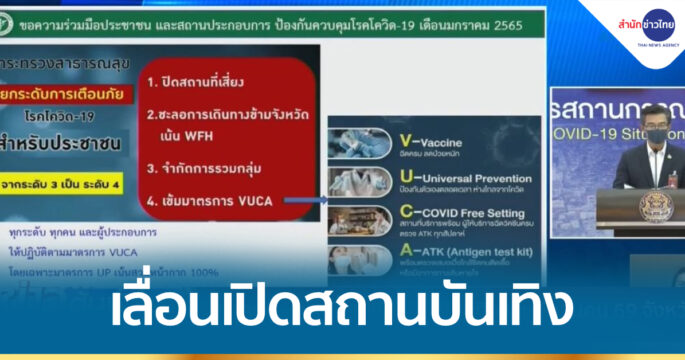 ศบค. เคาะเลื่อนเปิดสถานบันเทิง และพื้นที่ควบคุมจากเดิม 39 จังหวัด เพิ่มเป็น 69 จังหวัด และจังหวัดนำร่องท่องเที่ยว คงเดิม 8 จังหวัด มีผลตั้งแต่วันที่ 9 ม.ค.65 เป็นต้นไป