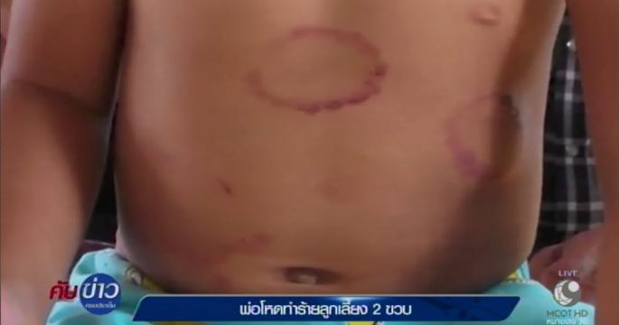 พ่อโหดทำร้ายลูกเลี้ยง 2 ขวบ เจ็บสาหัส ศรีษะ ใบหน้า มีบาดแผลเลือดซึม ลำตัวเขียวช้ำ แก้มด้านซ้าย หน้าอก และขาซ้าย มีรอยถูกกัด