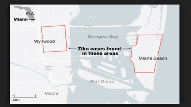 รัฐฟลอริดาของสหรัฐประกาศขยายพื้นที่ที่เชื้อไวรัสซิกาแพร่เชื้อในย่านชายหาดไมแอมีจาก 2.4 ตารางกิโลเมตรเป็น 7.2 ตารางกิโลเมตร หลังจากพบผู้ป่วยใหม่อีก 5 ราย
