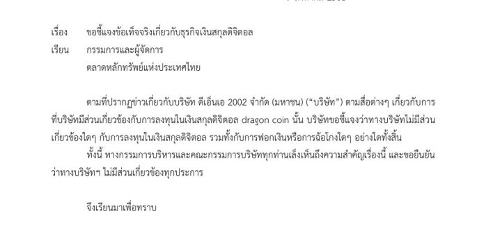 “ดีเอ็นเอ 2002” ยืนยันไม่มีส่วนเกี่ยวข้องการฟอกเงินหรือการฉ้อโกงในเงินสกุลดิจิทัล dragon coin
