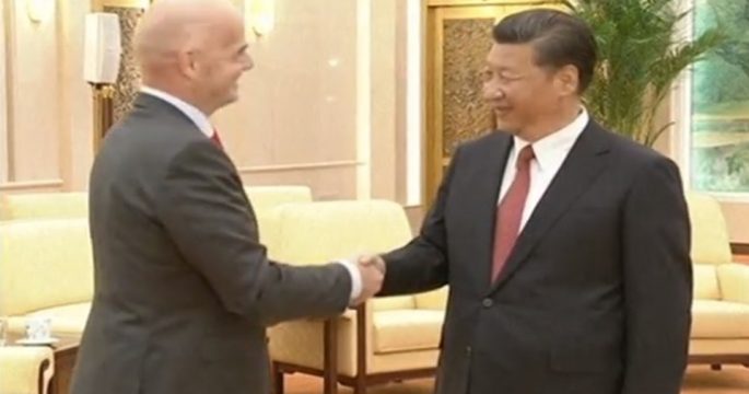 ประธานาธิบดีสี จิ้นผิงของจีนแสดงความหวังกับนายจานนี อินฟันตีโน ประธานสหพันธ์ฟุตบอลนานาชาติ (ฟีฟ่า) เรื่องจีนจะมีโอกาสได้เป็นเจ้าภาพการแข่งขันฟุตบอลโลก