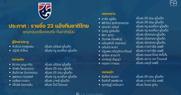 สมาคมกีฬาฟุตบอลแห่งประเทศไทย ในพระบรมราชูปถัมภ์ ประกาศรายชื่อ 23 นักกีฬาฟุตบอลทีมชาติไทย ชุดทำการแข่งขันฟุตบอลกระชับมิตรกับทีมชาติญี่ปุ่น ในวันที่ 1 มกราคม 2567