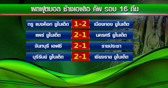 บุรีรัมย์ ยูไนเต็ด เฉือนชนะ เชียงราย ยูไนเต็ด แบบหืดขึ้นคอ หลังได้ประตูชัยในช่วงต่อเวลาพิเศษ ด้าน แบงค็อก ยูไนเต็ด แชมป์เก่า ถูกเขี่ยตกรอบ ศึกฟุตบอลช้าง เอฟเอ คัพ รอบ 16 ทีมสุดท้าย