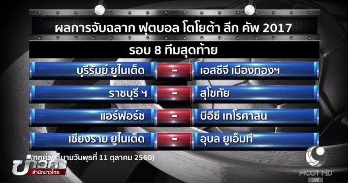 บุรีรัมย์ ยูไนเต็ด ทำศึกบิ๊กแมตช์กับ เอสซีจี เมืองทอง ยูไนเต็ด ในศึกฟุตบอลโตโยต้า ลีก คัพ รอบ 8 ทีมสุดท้าย ที่จะลงเตะทุกคู่พร้อมกัน วันที่ 11 ต.ค.นี้