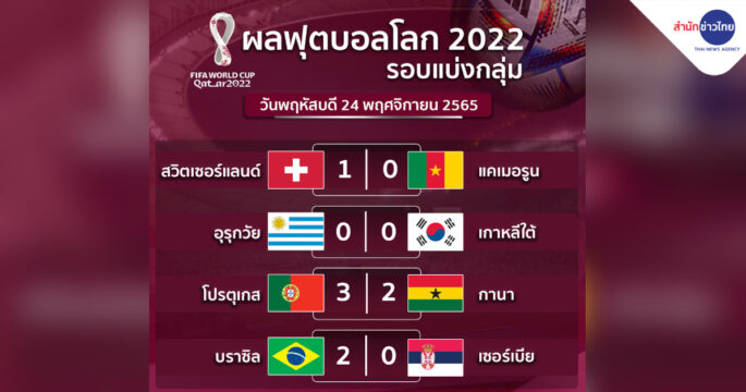 ผลฟุตบอลโลก 2022 รอบแบ่งกลุ่ม เมื่อคืนที่ผ่านมา ฝอยทองหืดจับเฉือนชนะกานา 3-2 ขณะที่ ริชาร์ลิซอน วอลเลย์สุดสวย พาแซมบ้า ประเดิมสวย นัดแรก