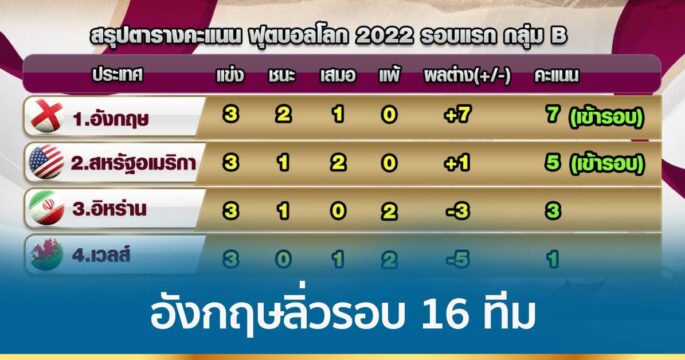 ทีมสิงโตคำราม อังกฤษ ต้องการเพียงแค่เสมอ เวลส์ ก็จะเข้ารอบ 16 ทีมสุดท้าย ส่วนอิหร่าน ต้องไปเตะชี้ชะตากับสหรัฐ