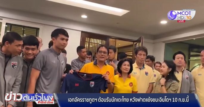 เอกอัครราชทูตไทย ณ กรุงจาการ์ตา เปิดบ้านเลี้ยงอาหารมื้อค่ำให้นักฟุตบอลทีมชาติไทย แนะให้เล่นแบบมืออาชีพ ไม่ต้องสนใจเสียงเชียร์เจ้าถิ่นในเกมพบอินโดนีเซีย วันที่ 10 ก.ย.นี้ มั่นใจไทยจะเก็บชัยได้