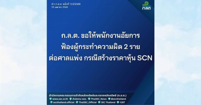 ก.ล.ต.ขอให้อัยการฟ้อง 2 ผู้กระทำผิด “ชนน วังตาล-ณัฐปภัสร์ เกสร์ชัยมงคล” กรณีสร้างราคาหุ้น SCN ให้ลงโทษทางแพ่งในอัตราสูงสุดตามที่กฎหมายกำหนด