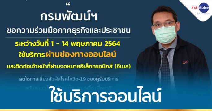 กรมพัฒนาธุรกิจการค้า แนะภาคธุรกิจและประชาชนใช้บริการกรมฯ ผ่านช่องทางออนไลน์ และติดต่อเจ้าหน้าที่ผ่านจดหมายอิเล็กทรอนิกส์ในช่วงเวลา วันที่ 1 – 14 พฤษภาคม 2564 นี้ เพื่อลดการติดเชื้อโควิด-19