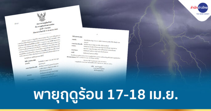 กรมอุตุนิยมวิทยา ออกประกาศฉบับที่ 7 “พายุฤดูร้อน” มีผลกระทบตั้งแต่ 17-18 เมษายน 2565 เตือนภาคอีสาน ระวังฝนฟ้าคะนอง ลมกระโชกแรง และมีลูกเห็บตกบางแห่ง