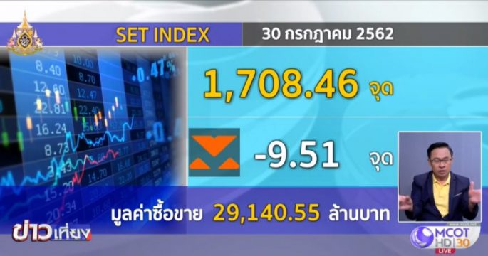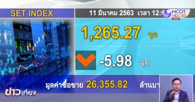 หุ้นไทยร่วงแรงตั้งแต่เปิดตลาด ดิ่งสุดที่ 1,131.70 จุด หรือลดไปกว่า 118 จุด กว่า 9% ซึ่งดัชนีช่วงเที่ยงอยู่ที่ 1,143.73 จุด ลดลง 106.16 จุด มูลค่าการซื้อขาย 49,955.38 ล้านบาท หลังหุ้นดาวโจนส์ร่วงแรงกว่า 1,400 จุด