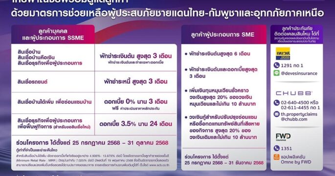 กรุงเทพฯ​ 26 ก.ค.- ธนาคารไทยพาณิชย์ ออกมาตรการเร่งด่วนเพื่อช่วยเหลือลูกค้าที่ได้รับผลกระทบจากสถานการณ์ความขัดแย้งระหว่างไทย-กัมพูชา และอุทกภัยในพื้นที่ภาคเหนือ ธนาคารไทยพาณิชย์ แจ้งว่าได้ออกมาตรการเร่งด่วนช่วยเหลือ ทั้งลูกค้าบุคคล ลูกค้าสินเชื่อธุรกิจเพื่อผู้ประกอบการ และลูกค้าผู้ประกอบการ SME โดยให้ความช่วยเหลือสำหรับลูกค้าปัจจุบันและลูกค้าใหม่ ทั้งในรูปแบบการพักชำระหนี้ และการสนับสนุนสินเชื่อใหม่เพื่อซ่อมแซมที่อยู่อาศัย รวมถึงฟื้นฟูกิจการที่ได้รับผลกระทบ โดยมีรายละเอียดดังนี้ -สำหรับลูกค้าปัจจุบัน – สินเชื่อบ้าน และสินเชื่อบ้านคือเงิน (My Home My Cash) พักชำระเงินต้นนาน 3 เดือน  -สำหรับลูกค้าใหม่ – สินเชื่อบ้านได้เพิ่มเพื่อซ่อมแซมบ้าน (สินเชื่อบ้านได้เพิ่ม สำหรับลูกค้าสินเชื่อบ้าน (Home Loan Top Up) หรือสินเชื่อบ้านได้เพิ่ม สำหรับลูกค้าสินเชื่อบ้านคือเงิน (My Home My Cash Top Up)) ดอกเบี้ย 0% นาน 3 เดือน ฟรีค่าประเมินราคาหลักประกัน ได้แก่ บ้านเดี่ยว บ้านแฝด ทาวน์เฮาส์ ทาวน์โฮม คอนโดมิเนียม และอาคารพาณิชย์ -ลูกค้าสินเชื่อรถยนต์ สามารถพักชำระหนี้สูงสุด 3 […]