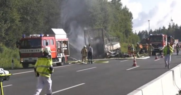 ตำรวจเยอรมนีกล่าวคาดว่า อาจมีผู้เสียชีวิตถึง 17 คนจากอุบัติเหตุรถทัวร์ระเบิดไฟลุกท่วมภายหลังชนเข้ากับรถบรรทุกพ่วงทางภาคใต้ของเยอรมนีวันนี้