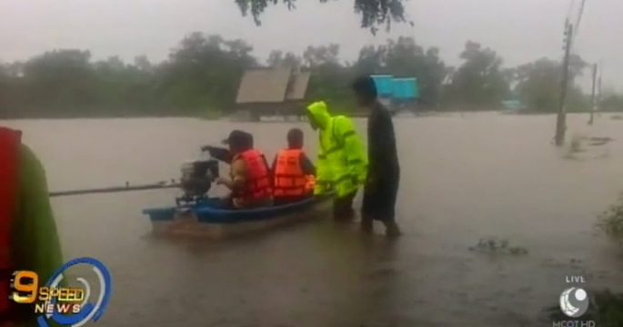 ที่นครศรีธรรมราช ฝนที่ตกลงมาอย่างต่อเนื่อง ทำให้เกิดน้ำท่วมหลายพื้นที่ ชาวบ้านบางรายอพยพหนีน้ำไม่ทันติดอยู่ในบ้าน เจ้าหน้าที่ต้องนำเรือหางยาวเข้าไปช่วย