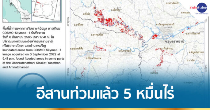 GISTDA เผยภาพถ่ายดาวเทียมสถานการณ์น้ำท่วมในเขตภาคอีสาน พบพื้นที่น้ำท่วมขังแล้วกว่า 5 หมื่นไร่ อุบลฯ หนักสุด ท่วมกว่า 2 หมื่นไร่