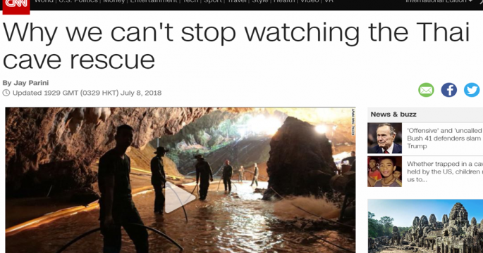 นักเขียนชาวอเมริกันเขียนลงเว็บไซต์ซีเอ็นเอ็นว่า ทั่วโลกกำลังจดจ่ออยู่ที่ไทยเฝ้าติดตามนักดำน้ำผู้กล้าหาญเสี่ยงชีวิตช่วยเยาวชนไทย 13 คนติดในถ้ำหลวง-ขุนน้ำนางนอน