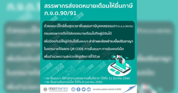 กรมสรรพากรส่งจดหมายเตือนให้ยื่นภาษี ภ.ง.ด.90/91 โดยยื่นแบบฯ ตนเองได้ที่สำนักงานสรรพากรพื้นที่สาขา ภายใน 31 มี.ค.65 หรือยื่นผ่านอินเทอร์เน็ตได้ถึงวันที่ 8 เม.ย.65 เท่านั้น
