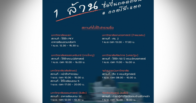 สำนักข่าวไทย 1 เม.ย.-7 มหาวิทยาลัยทั่วประเทศ ยังตั้งโต๊ะล่ารายชื่อตรวจสอบการทำงานของกกต.ต่อเนื่อง หวังครบ 1 ล้านคน ผู้สื่อข่าวรายงานว่า วันนี้ (1 เม.ย.62) มีมหาวิทยาลัย 7 แห่งทั่วประเทศ ได้แก่ มหาวิทยาลัยพะเยา มหาวิทยาลัยเกษตรศาสตร์ วิทยาเขตกำแพงแสน ,มหาวิทยาลัยสงขลานครินทร์ วิทยาเขตหาดใหญ่ ,มหาวิทยาลัยศิลปากร วิทยาเขตพระราชวังสนามจันทน์ , มหาวิทยาลัยวลัยลักษณ์ , จุฬาลงกรณ์มหาวิทยาลัย และมหาวิทยาลัยธรรมศาสตร์ วิทยาเขตรังสิต ยังคงทำกิจกรรมตั้งโต๊ะล่ารายชื่อ ให้มีการตรวจสอบการทำงานของคณะกรรมการการเลือกตั้ง (กกต.) เพื่อสร้างมาตรฐานการทำงานที่โปร่งใสให้เกิดขึ้นในสังคมไทยอย่างต่อเนื่อง สืบเนื่องจากหลังจัดการเลือกตั้งเมื่อวันที่ 24 มี.ค.ที่ผ่านมา ซึ่งมีข้อกังขา นำไปสู่การรวบรวมรายชื่อในแคมเปญ “1 ล้านชื่อยื่นถอดถอน #กกตโป๊ะแตก ผ่านเว็บไซต์ Change.org ซึ่งขณะนี้มีผู้มาลงชื่อแล้วเกือบ 833,000 คน โดยคาดว่าจะทำกิจกรรมต่อเนื่องไปจนกว่าจะครบ 1 ล้านรายชื่อ.-สำนักข่าวไทย