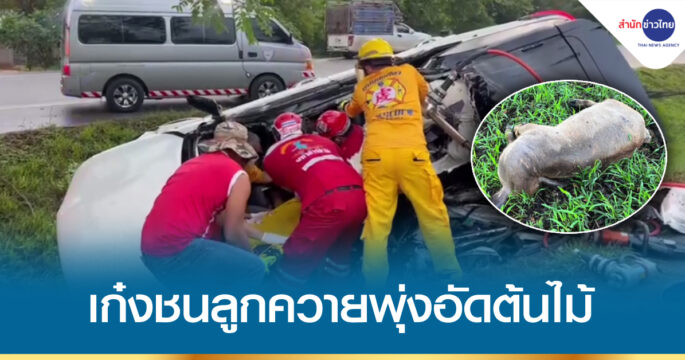 เก๋งชนลูกควายเสียหลักพุ่งอัดต้นไม้ ดับ 1 เจ็บ 2
