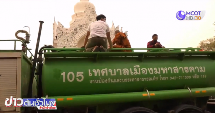 มหาสารคามปล่อยรถบรรทุกน้ำมนต์ออกฉีดพ่นตาม 4 มุมเมือง เพื่อขับไล่โรคภัย ตามความเชื่อ