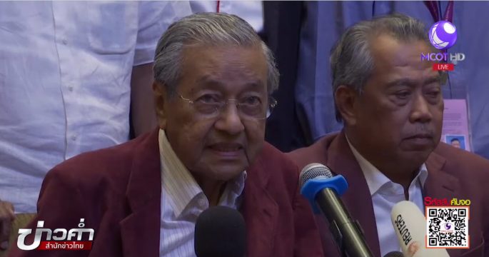 ดร.มหาเธร์ โมฮัมหมัด อดีตนายกรัฐมนตรีมาเลเซีย สร้างประวัติศาสตร์นำพรรคฝ่ายค้านคว้าชัยชนะในการเลือกตั้งทั่วไปเหนือพรรครัฐบาลของนายกรัฐมนตรีนาจิบ ราซัค ได้แบบล็อกถล่ม