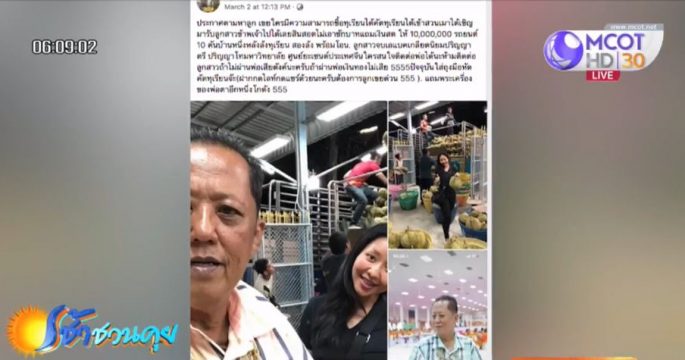 โซเชียลฮือฮา มหาเศรษฐีรับซื้อทุเรียนที่ชุมพร โพสต์เฟซบุ๊กประกาศตามหาลูกเขย คุณสมบัติความรู้ไม่ต้อง เอาแค่อ่านออกเขียนได้ ขอให้ขยันอดทนทำงาน ประหยัด เป็นคนที่ลูกสาวและครอบครัวยอมรับ พร้อมให้ทุนทำกิน 10 ล้านบาท คนแห่แชร์และคอมเมนต์กันคึกคัก