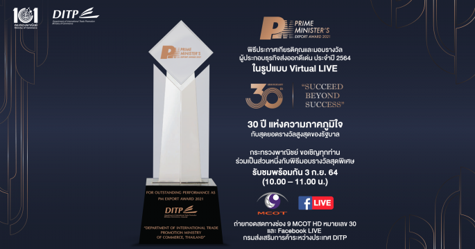 เชิญชวนติดตามรับชมพิธีมอบรางวัลผู้ประกอบธุรกิจส่งออกดีเด่น ปี 2564 (PM Export Award 2021) รูปแบบ Virtual Live วันศุกร์ที่ 3 ก.ย.64 เวลา 10.00-11.00 น. ถ่ายทอดสดทางช่อง 9 MCOT HD หมายเลข 30