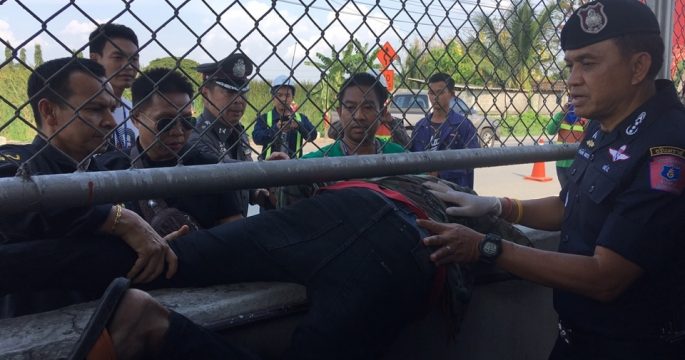 เจ้าหน้าที่มูลนิธิระดมกำลังใช้เครื่องมือตัดถ่าง เปิดประตูรถตู้ทะเบียน 33 – 0860 กทม. เพื่อนำตัวนายมนตรี สุเทพ อายุ 29 ปี ส่งโรงพยาบาลใกล้เคียง