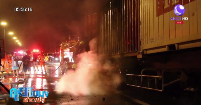หนุ่ม 32 ขับรถพ่วง 18 ล้อจะไปส่งสินค้า ระหว่างทางเบรกติดล้อหลังตัวพ่วง ทำให้เกิดไฟไหม้ คนขับรีบจอดแล้วถอดหัวลาก พยายามดับไฟแต่เอาไม่อยู่ ตู้สินค้าเสียหาย 1 ตู้