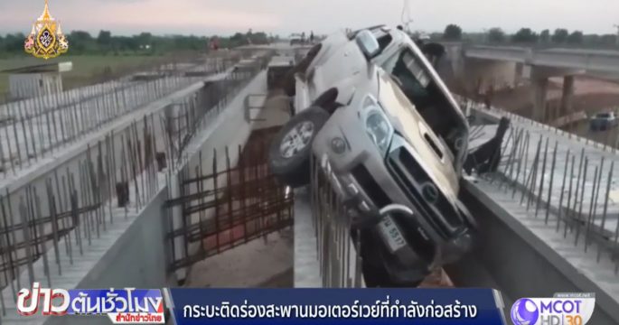 กระบะซิ่งขึ้นแนวก่อสร้างสะพานข้ามทางมอเตอร์เวย์สายโคราช-บางปะอิน โชคดีไม่หล่นลงมาด้านล่าง คนขับบาดเจ็บเล็กน้อย