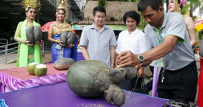 สวนนงนุชพัทยาปอกมะพร้าวแฝดราคาหลักหมื่นบาทให้นักท่องเที่ยวชิมรสชาติ หลังรอมา 39 ปี เผยกว่าผลจะงอกใช้เวลาเป็นปี มีลักษณะผลแฝด ชาวบ้านเรียกมะพร้าวก้นสาว