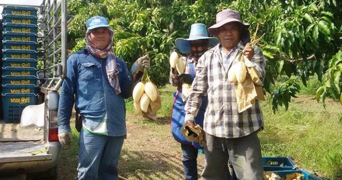 ประจวบคีรีขันธ์ 4 ก.ย.- มะม่วงน้ำดอกไม้สีทองนอกฤดูกาลของเกษตรกรกลุ่มวิสาหกิจชุมชนฯ เมืองประจวบฯ โดนใจตลาดต่างประเทศทั้งรสชาติและคุณภาพ ล่าสุดเกาหลีสั่งออเดอร์นับสิบตันต่อสัปดาห์ แต่ผลผลิตไม่พอกับความต้องการ นายพนม ซำเผือก ประธานกลุ่มวิสาหกิจชุมชนผู้ปลูกมะม่วงเพื่อการส่งออก ต.อ่าวน้อย อ.เมือง จ.ประจวบคีรีขันธ์ เปิดเผยว่า หลังจากมีการรวมกลุ่มผู้ปลูกมะม่วงนอกฤดูกาลเป็นเกษตรแปลงใหญ่พื้นที่กว่า 3,000 ไร่ เพื่อการส่งออกและพัฒนาคุณภาพของผลผลิตให้ได้มาตรฐาน จนกลายเป็นที่นิยมของตลาดต่างประเทศอย่างมาก ล่าสุดตัวแทนบริษัทส่งออกจากเกาหลีได้เดินทางเจรจามาติดต่อเพื่อซื้อมะม่วงน้ำดอกไม้สีทองเกรด เอ ราคากิโลกรัม (กก.) ละ 120–130 บาท สัปดาห์ละ 9-10 ตัน เนื่องจากผลผลิตของไทยมีคุณภาพได้รับการรับรองมาตรฐานจีเอ็มพี ปลอดสารพิษและรสชาติดีกว่า แต่ผลผลิตที่ลูกค้าต้องการไม่เพียงพอในการจำหน่าย เพราะพื้นที่ปลูกมะม่วงน้ำดอกไม้สีทองที่มีผลิตนอกฤดูกาลมีเฉพาะในพื้นที่ อ.สามร้อยยอด และ อ.เมืองประจวบคีรีขันธ์ ทางตัวแทนบริษัทรับซื้อจากเกาหลีจึงเสนอขอทำสัญญาซื้อขายล่วงหน้าระยะยาว เพราะต้องการผลผลิตไม่จำกัดจำนวน แต่กลุ่มเกษตรกรไม่สามารถดำเนินการได้ เพราะหากผลิตไม่ตรงตามกำหนดจะถูกปรับ จึงขอมาเป็นการจัดหาผลผลิตให้ได้มากที่สุด ซึ่งจะกระทบกับผู้บริโภคในประเทศของไทยบ้าง และจากการสำรวจความต้องการของตลาดต่างประเทศมีเพิ่มขึ้นปีละ 20 % ทั้งในประเทศจีน สิงคโปร์ มาเลเซีย และ ฮ่องกง ทำให้เกษตรกรบางรายหันมาปลูกมะม่วง จากเดิมใช้พื้นที่ปลูกสับปะรด.-สำนักข่าวไทย