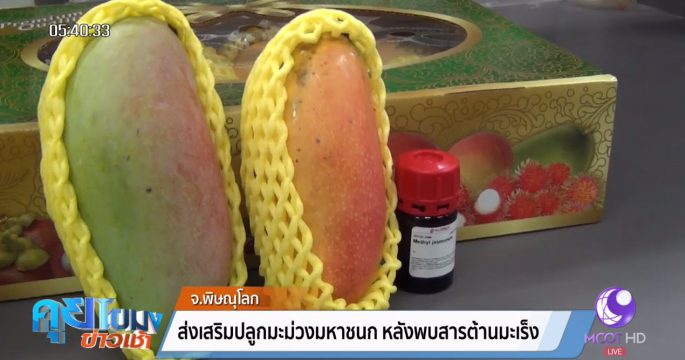 อาจารย์มหาวิทยาลัยนเรศวร เตรียมต่อยอดส่งเสริมปลูกมะม่วงมหาชนก หลังพบสารต้านมะเร็งในมะม่วงสุก พร้อมให้ความรู้ในการใช้สารละลายเมทิลจัสโมเนต เพื่อทำให้มะม่วงมีผลสีแดง เป็นที่ต้องการของตลาด