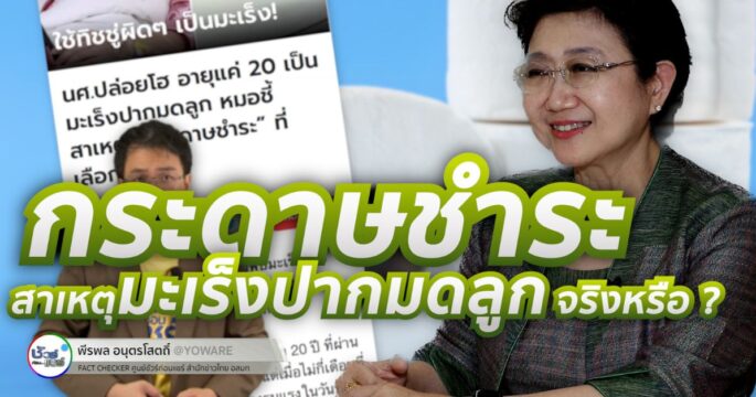 15 เมษายน 2567 – บนโซเชียลแชร์ข่าวจากต่างประเทศ พาดหัวว่า ใช้ทิชชู่ผิด ๆ เป็นมะเร็ง นักศึกษาอายุแค่ 20 แต่เป็นมะเร็งปากมดลูก ชี้สาเหตุมาจาก “กระดาษชำระ” ที่เลือกใช้ บทสรุป : ไม่จริง ไม่ควรแชร์ ❌ ศูนย์ชัวร์ก่อนแชร์ ตรวจสอบกับ ศ.พญ.สฤกพรรณ วิไลลักษณ์ ภาควิชาสูติศาสตร์-นรีเวชวิทยา คณะแพทยศาสตร์โรงพยาบาลรามาธิบดี สัมภาษณ์เมื่อ 29 มีนาคม 2567 🔎 ตรวจสอบข้อเท็จจริง โดย พีรพล อนุตรโสตถิ์