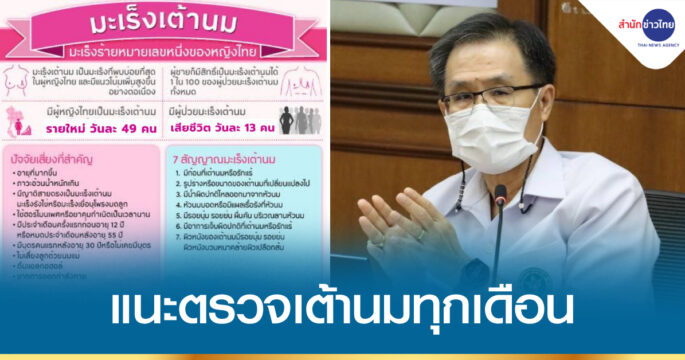 กรมอนามัยเผยข้อมูลสถิติของกระทรวงสาธารณสุข พบหญิงไทยป่วยด้วยโรคมะเร็งเต้านมสูงสุด จำนวน 38,559 ราย ในปี 2565 แนะควรตรวจเต้านมตนเองเป็นประจำทุกเดือน