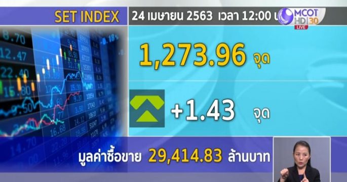 หุ้นไทยช่วงเที่ยงปิดบวก 1.43 จุด ที่ระดับ 1,273.96 จุด มูลค่าการซื้อขาย 29,414.83 ล้านบาท