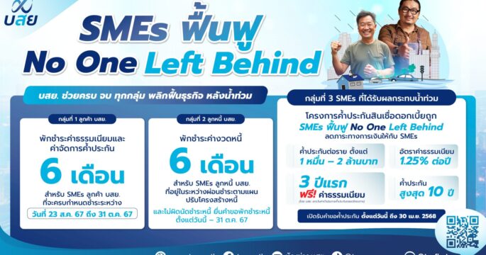บสย. เดินหน้าช่วย SMEs ผู้ประสบภัยน้ำท่วม ครอบคลุมทุกกลุ่ม ทั้งลูกค้า-ลูกหนี้ และ SMEs ที่ได้รับผลกระทบ ผ่าน 3 มาตรการเร่งด่วน “พักชำระค่าธรรมเนียม-ค่างวด” พร้อมอัดฉีดโครงการค้ำประกันสินเชื่อดอกเบี้ยถูก “SMEs ฟื้นฟู No One Left Behind” มุ่งลดภาระทางการเงิน เสริมสภาพคล่อง ช่วย SMEs พลิกฟื้นกิจการหลังน้ำท่วม