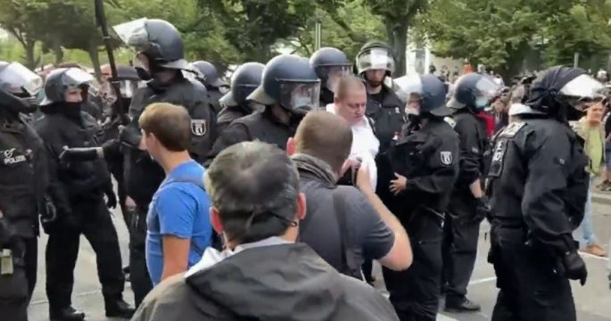 ตำรวจเยอรมนีรวบตัวผู้ชุมนุมประท้วงมาตรการเว้นระยะห่างทางสังคม เพื่อป้องกันการแพร่ระบาดของเชื้อโควิด-19 ไปดำเนินคดี