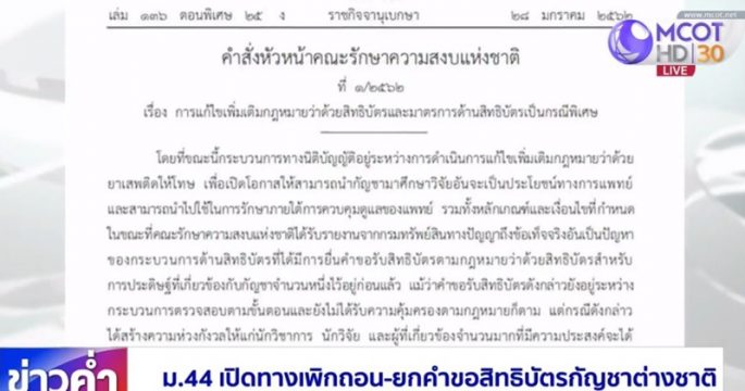 หัวหน้า คสช.ใช้มาตรา 44 ยับยั้งการจดสิทธิบัตรกัญชา เปิดทางให้เพิกถอน-ยกคำขอสิทธิบัตรกัญชาต่างชาติได้ โดยสามารถสั่งยกเลิกภายใน 90 วัน มีผลบังคับใช้ตั้งแต่วันนี้