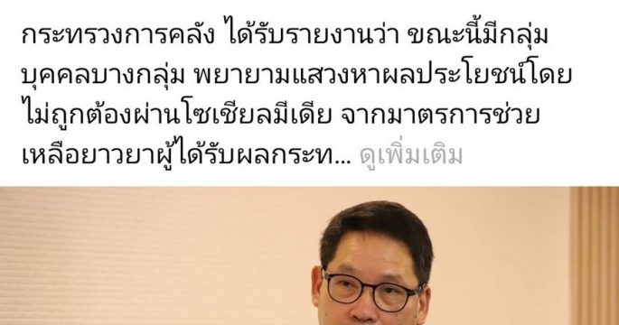 กรุงเทพฯ 28 มี.ค.- นายอุตม สาวนายน รัฐมนตรีว่าการ ได้โพสท์ เฟซบุ๊ค ระบุว่า กระทรวงการคลัง ได้รับรายงานว่า ขณะนี้มีกลุ่มบุคคลบางกลุ่ม พยายามแสวงหาผลประโยชน์โดยไม่ถูกต้องผ่านโซเชียลมีเดีย จากมาตรการช่วยเหลือยาวยาผู้ได้รับผลกระทบจากการระบาดของไวรัสโควิด-19 จำนวน 5,000 บาทต่อเดือน ทั้งนี้กลุ่มบุคคลดังกล่าว ได้พยายามชักจูงให้ประชาชนบอกหมายเลขบัญชี โดยอ้างว่าจะรับลงทะเบียนให้ เพื่อแลกเปลี่ยนกับความสะดวก รวมทั้งขอค่าตอบแทนบางส่วนจากเงินที่ได้รับจากมาตรการช่วยเหลือนี้ ขอแจ้งเตือนพี่น้องประชาชนว่า อย่าหลงเชื่อผู้ที่หาผลประโยชน์โดยไม่ถูกต้องเหล่านั้น เพราะท่านจะมีความเสี่ยงได้รับความเสียหายทางการเงินตามมา ขณะเดียวกันขอวิงวอนให้กลุ่มบุคคลดังกล่าว หยุดดำเนินการเอาเปรียบประชาชนทันที กระทรวงการคลังได้แจ้งให้ทุกฝ่ายที่เกี่ยวข้อง ตรวจสอบกรณีข้างต้นแล้ว และพร้อมจะดำเนินตามกฎหมายอย่างถึงที่สุด เพราะถือเป็นการเอาเปรียบและซ้ำเติมพี่น้องประชาชนที่เดือดร้อนอย่างหนักอยู่แล้ว.-สำนักข่าวไทย