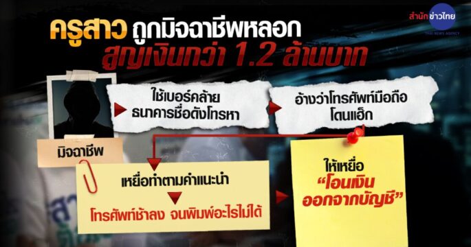 ครูสาวชาวอุบลราชธานี ถูกมิจฉาชีพอ้างตัวเป็นหน่วยงานราชการ และเจ้าหน้าที่ธนาคาร ใช้เบอร์ธนาคารโทรหาจึงหลงเชื่อ สูญเงินกว่า 1.2 ล้านบาท